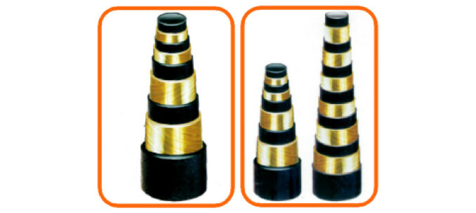主要有內(nèi)膠層、中膠層、2、4、6層鋼絲纏繞層、外膠層組成。內(nèi)膠層具有輸送介質(zhì)、承受壓力,保護鋼絲不受侵蝕的作用,外膠層保護鋼絲不受損傷,鋼絲層是骨架材料,起增強作用。